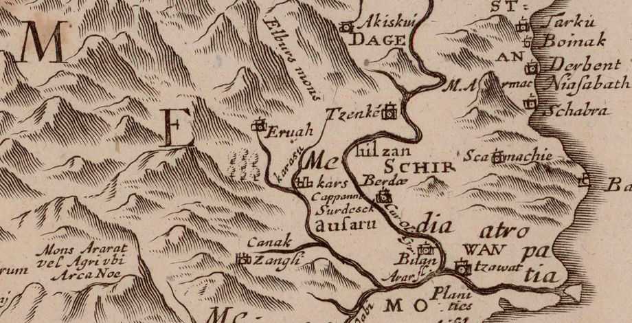 Extrait d'une carte de la Perse publiée en 1650 qui montre les fleuves Araxe et Cyrus, la côte ouest de la mer Caspienne et le mont Albordj.↩Dernière mise à jour : 7 sept. 2021